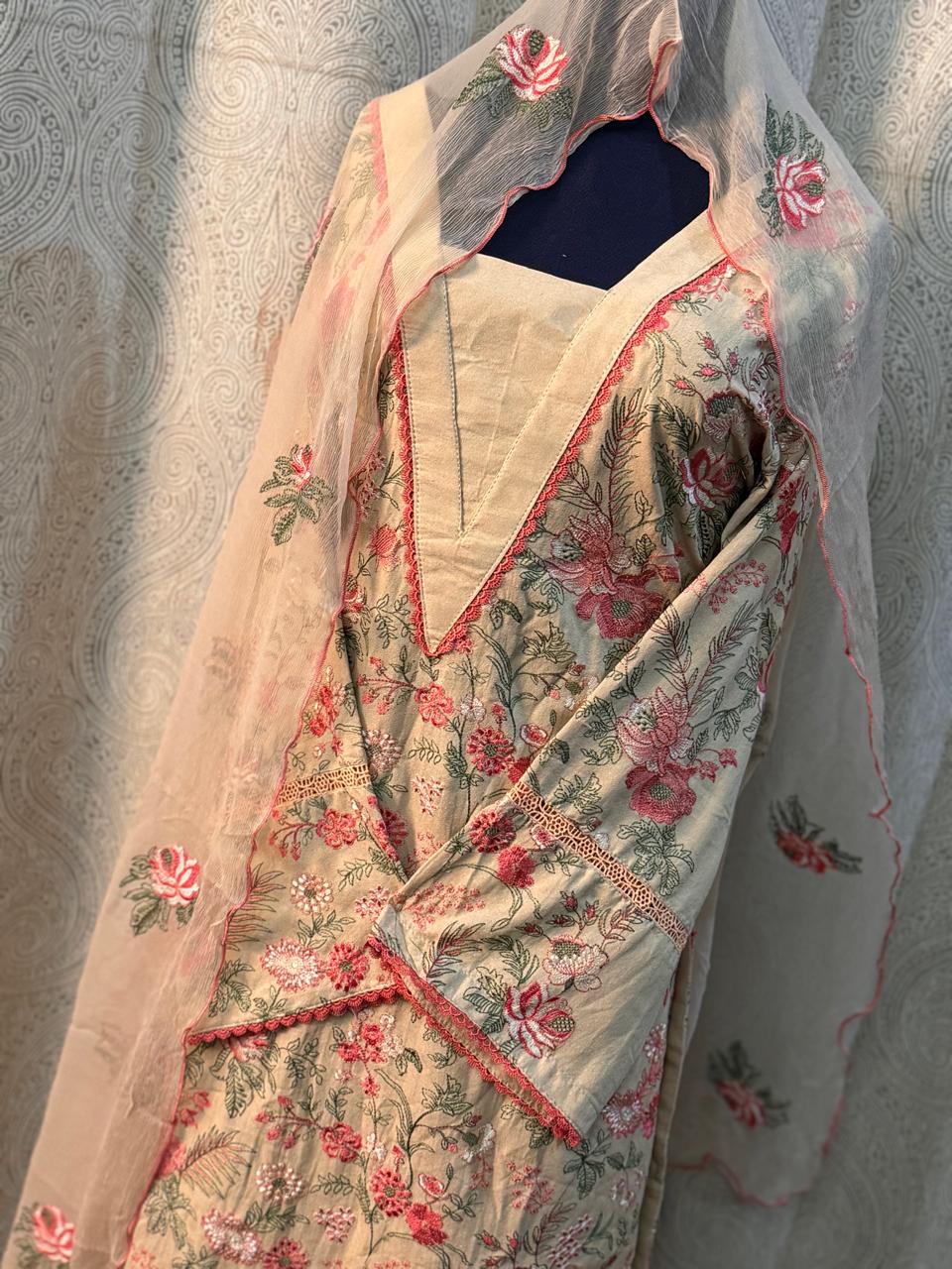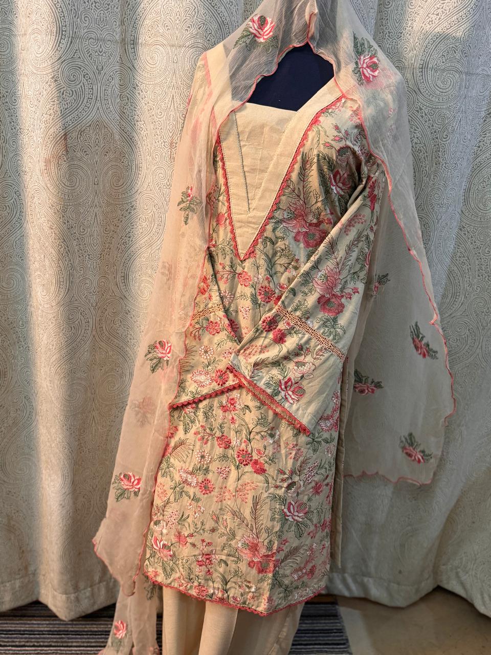 ready to wear desi style trouser shirt, fully embroidered with beautiful chiffon duppata.
