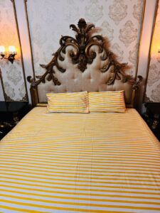 Pure King size cotton bed sheet jet white base with Yellow stripes on it, including two pillow covers with same colour & stripes like bed spread.