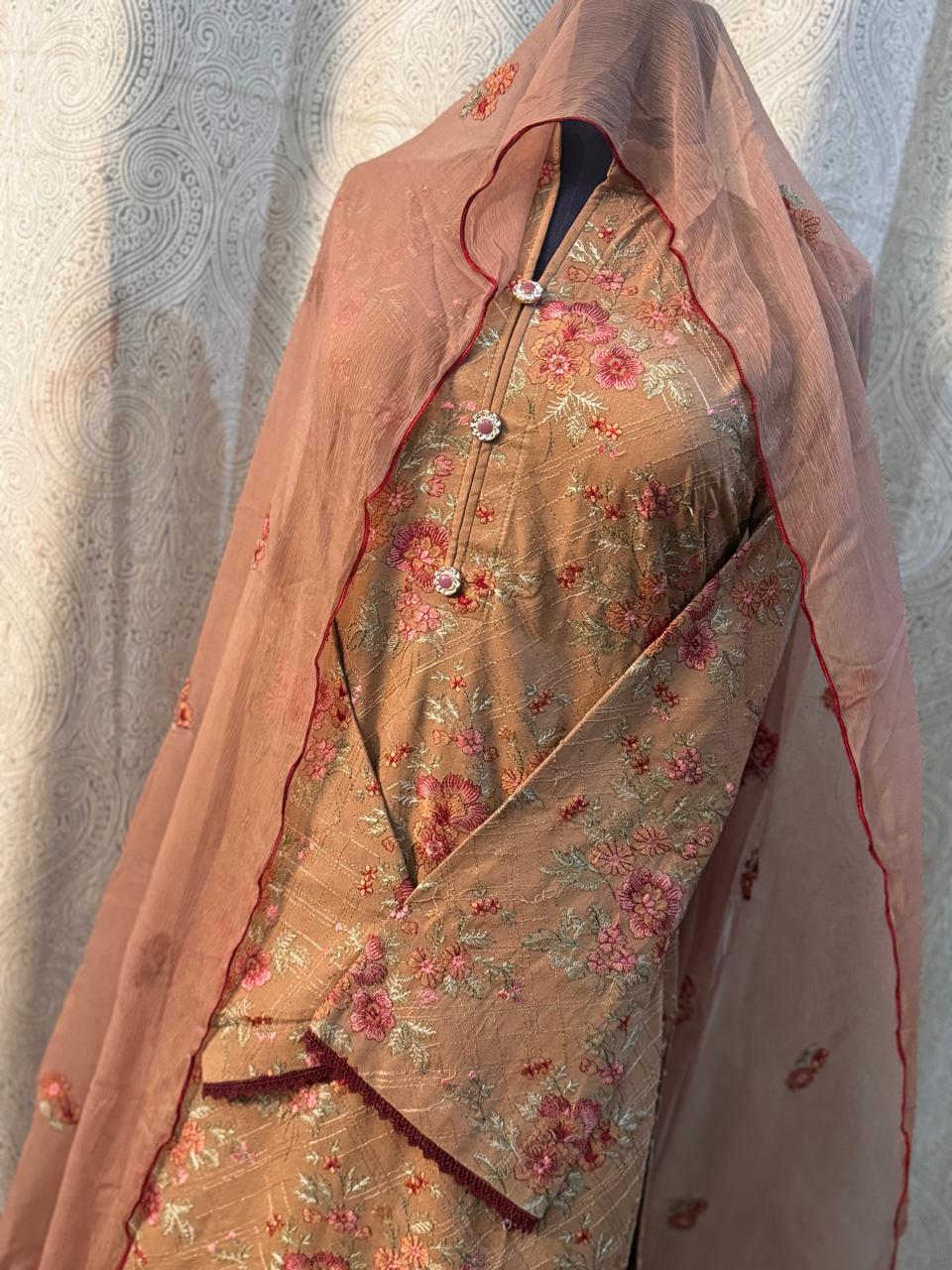 Desi style, ready to wear out fit in brown base with multi thread work on it including embrioderd chiffon duppata.