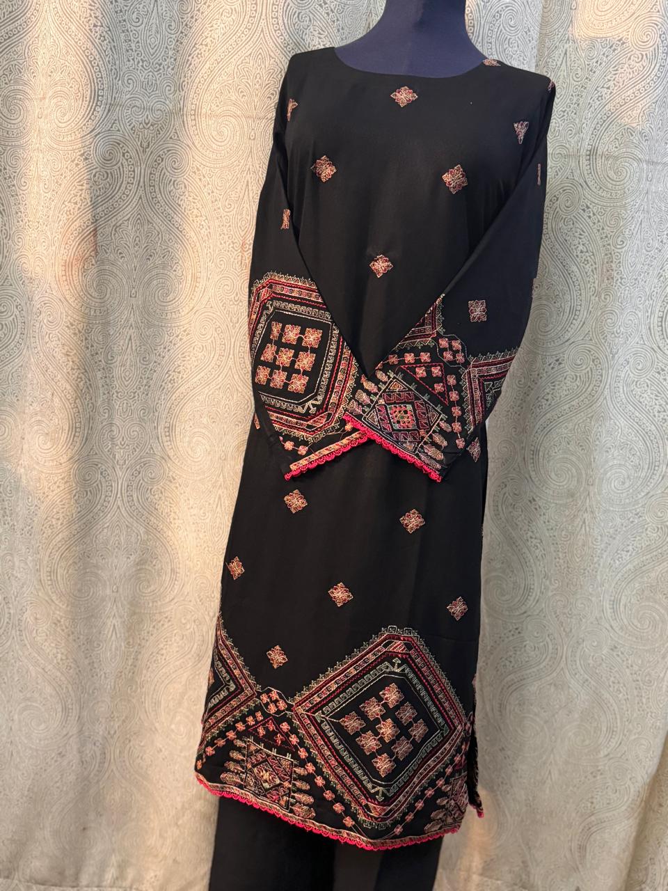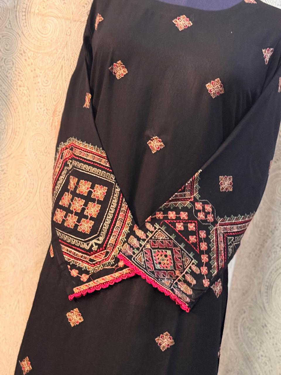 ready to wear trouser,shirt in jet black shade with classic thread work on shirt borders & sleeves. trouser is of same fabric & in same colour.
