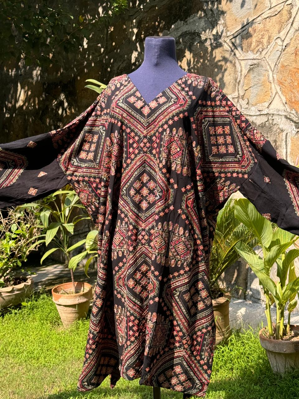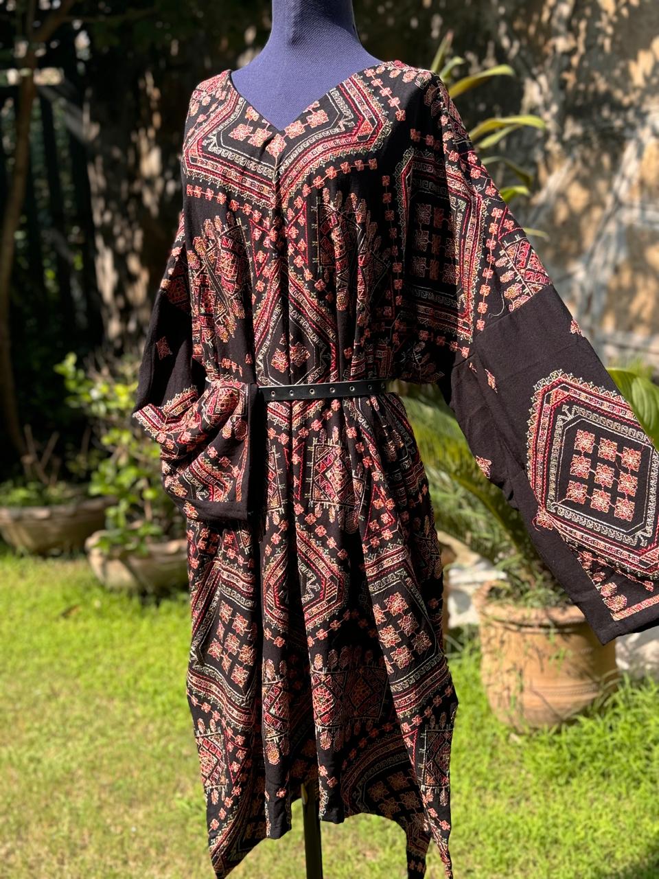stylish long black kaftan ready to wear with multi embroidery overall.