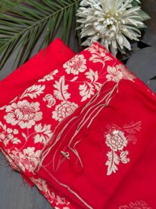 Our Red unstitched three piece boski linen shalwar kameez in heavy embroidery beige color on the shirt including beautiful chiffon duppata with piko on the four sides is perfect for creating your own unique outfit. the Red color is attention grabbing, dynamic & intense color which can be used to trigger opposite emotions.