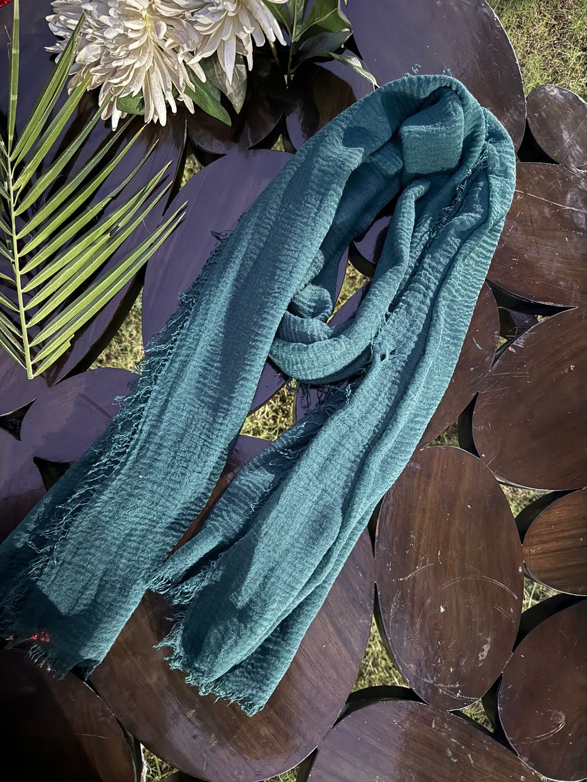 Blue plain scarf in a very fine & soft material. A plain light fabric typically has properties like being light weight, breathable,smooth to the touch, easily dyed in any color, realitively durable due to its tight weave, versatile for scarfs & dupatta specailly & very comfortable to wear & style with both western & eastern clothing.