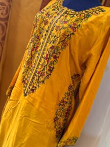 A mustard yellow dress is a dress that is dusky shade of yellow that is darker then jasmine & browner than flax. It can be flattering choice for people with medium to dark skin tones. The outfit is nicely embroidered by a beautiful thread work on neck & sides pockets of the shirt. Its a Two piece ready to wear Kurta, trouser suit perfect for formal & sami formals.