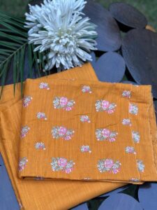 Mustard is an eye catching color especially in winters it looks great, the embroidery on the fabric in light pink & green shade compliments each other. The color & design also complements each other well, this winters add this beauty into a wardrobe will help people shine their personality.