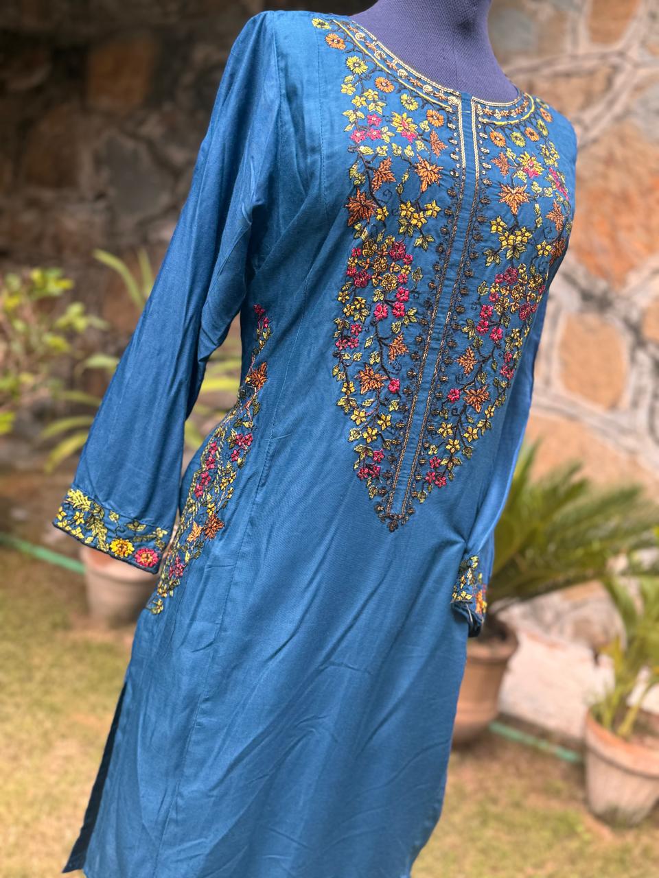 Blue ready to wear shirt with  trouser in desi style,The outfit is nicely embroidered by beautiful thread work on neck & side pockets of the shirt.its two piece ready to wear  kurta, trouser suit perfect for formal & semi formals.