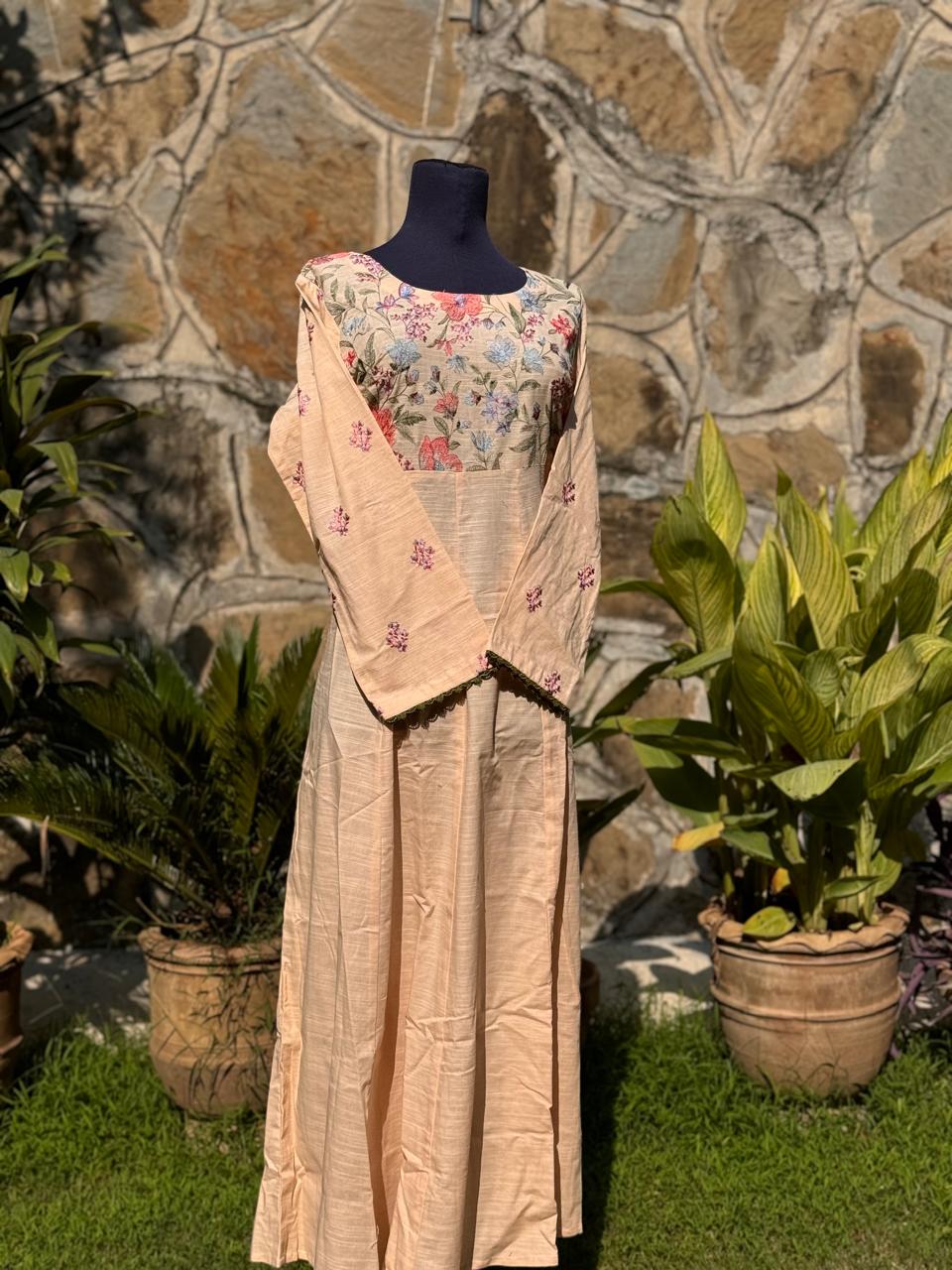Ready to wear Maxi style Frock in Peach shade with little embroidery on its body & sleeves best for winter can be worn it both seasons also. The fabric on which dress is made has a roughly textured yet soft & firm fabric that provides comfort & durability. It is ideal for winter wear & its crafted to resist shrinkage & slippage, making it is a reliable choice for those seeking a blend & functionality.