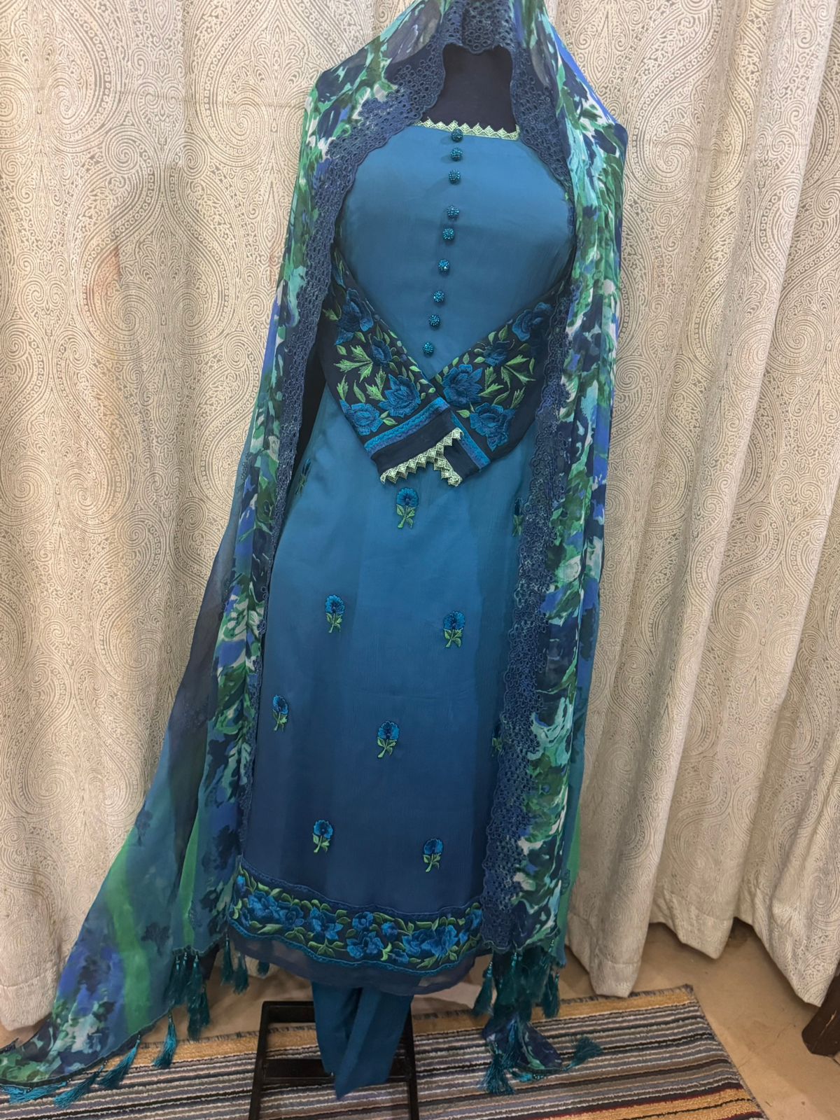 Ready to wear Royal blue three piece dress with desi style long duppata & shirt, including plain capri “trouser”. it could be a a party dress too.
