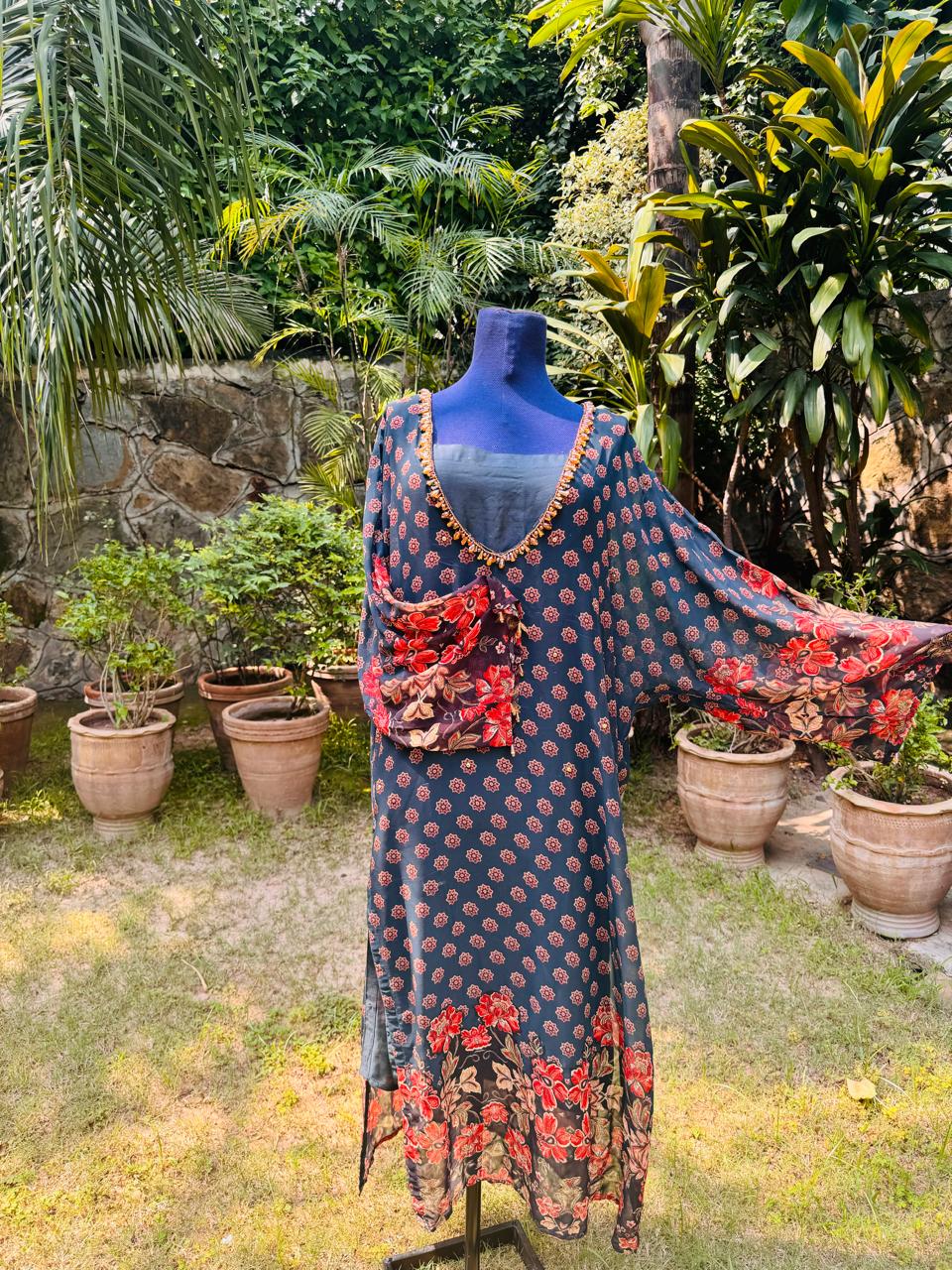 ready to wear Sea Green chiffon with orange floral border stylish long Kaftan, oerfect for formal & semi formals.