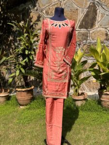 Ready to wear trouser & shirt in tea pink silk. The outfit is nicely embriordard by a beautiful thread work on the shirts front & also to enhance its beauty the delicate cut work is done on the neck line with beige color on it.This refreshing colour looks pretty in this design of desi outfit.